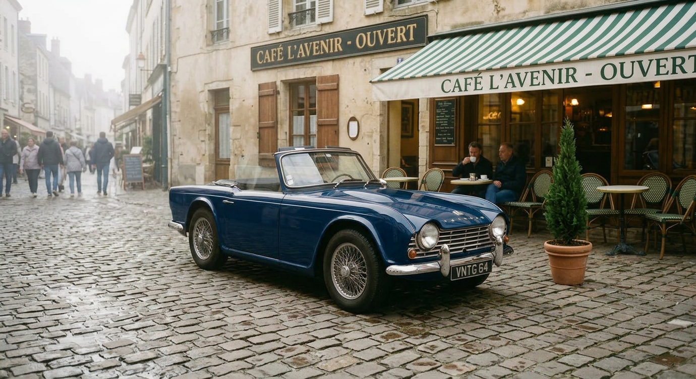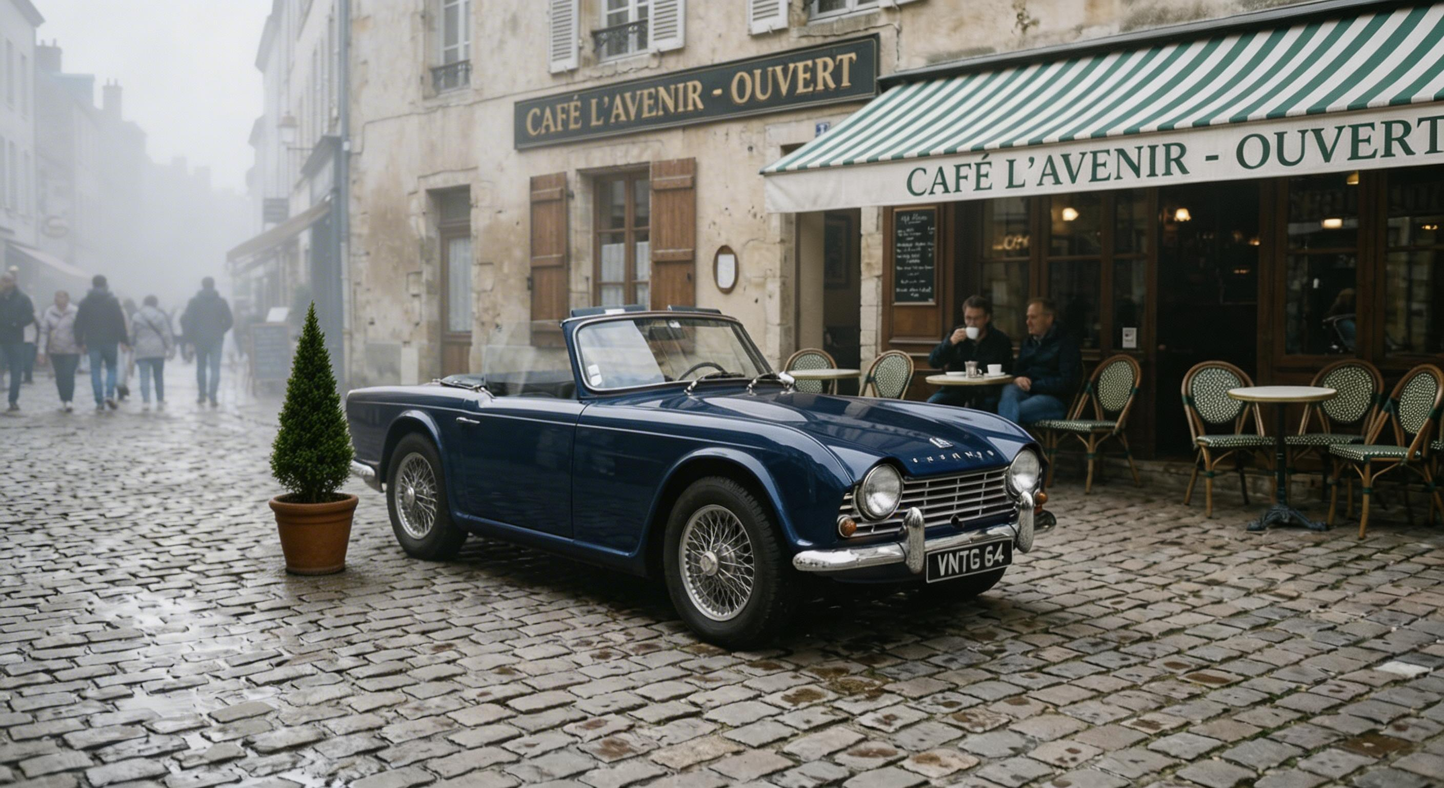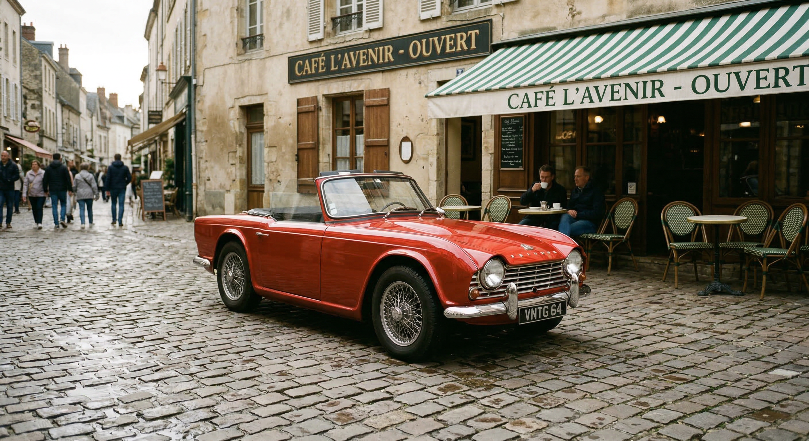 Source image prompt: "A photo of a red vintage car parked on a cobblestone street with a cafe in the background."