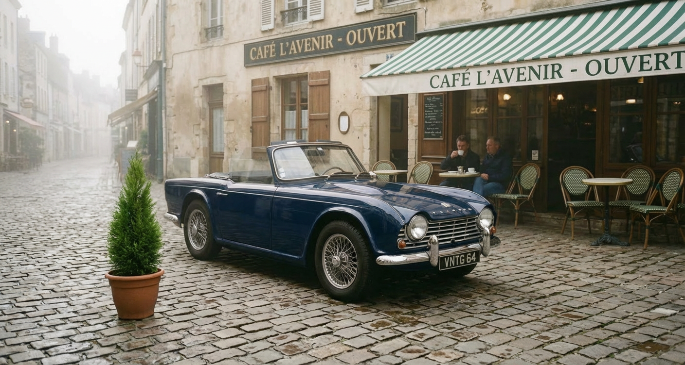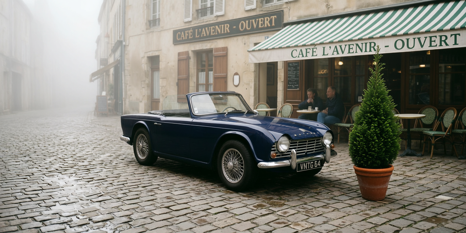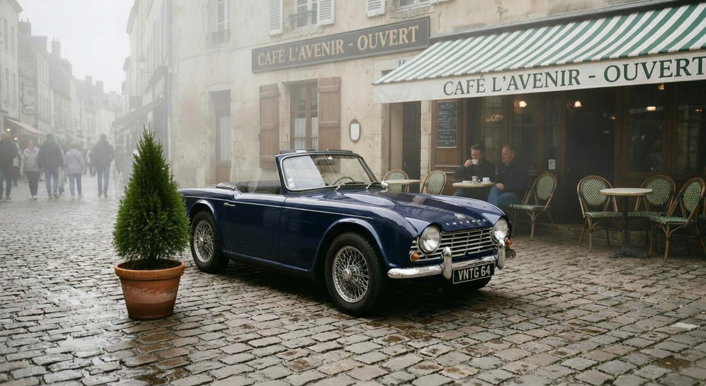 Source image prompt: "A photo of a red vintage car parked on a cobblestone street with a cafe in the background."