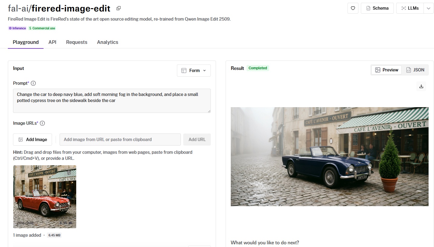 | FireRed Image Edit | Developers who want open-source editing with bilingual instruction support and tunable acceleration modes | $0.0325/megapixel on fal. |