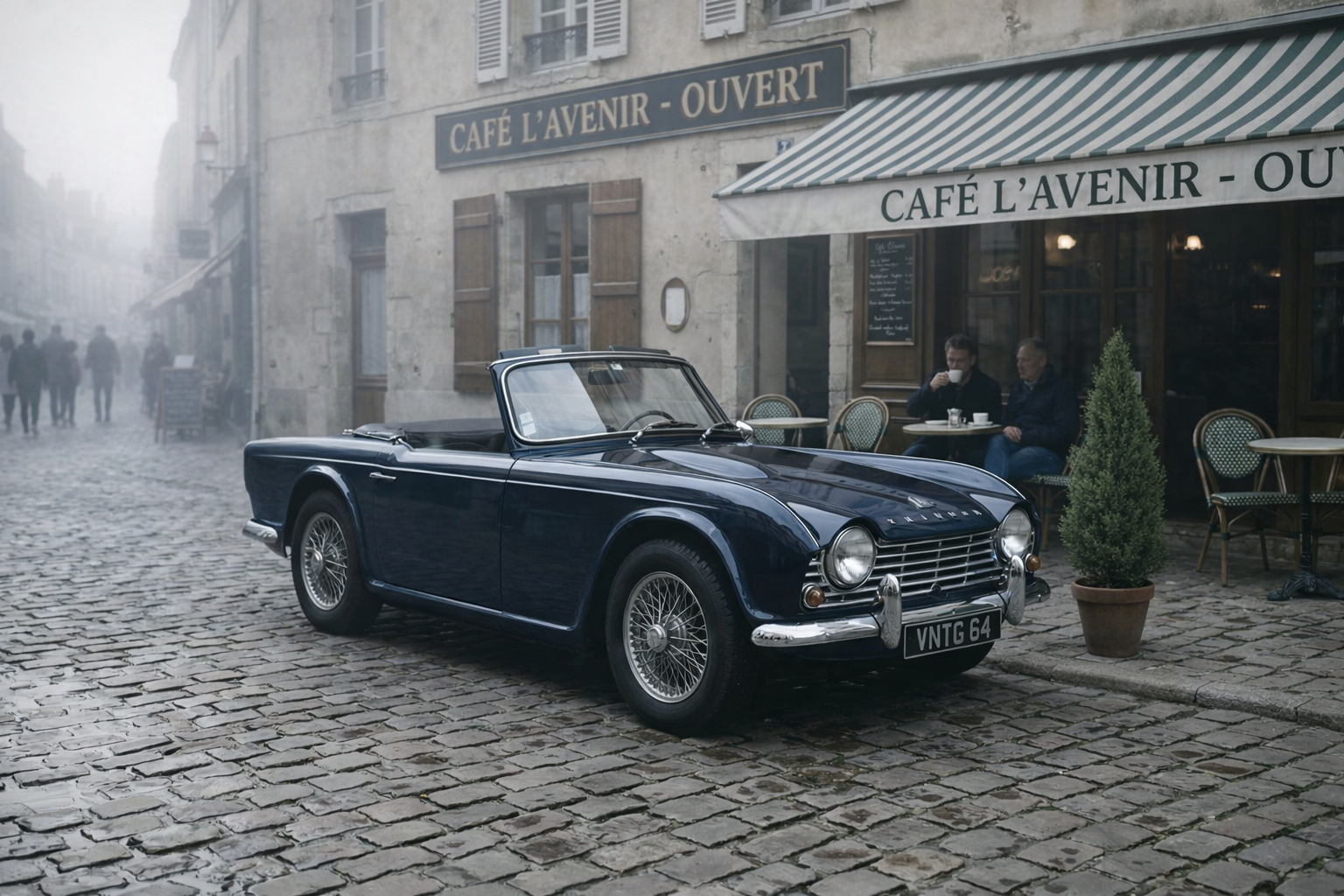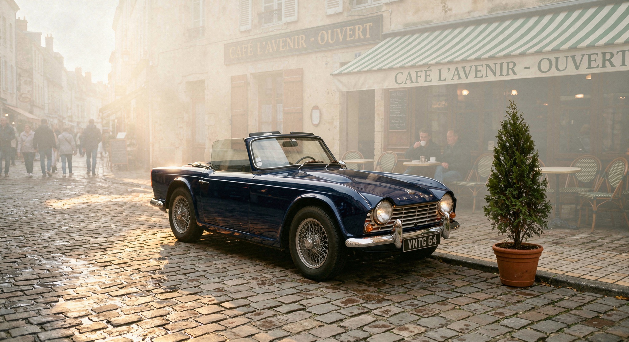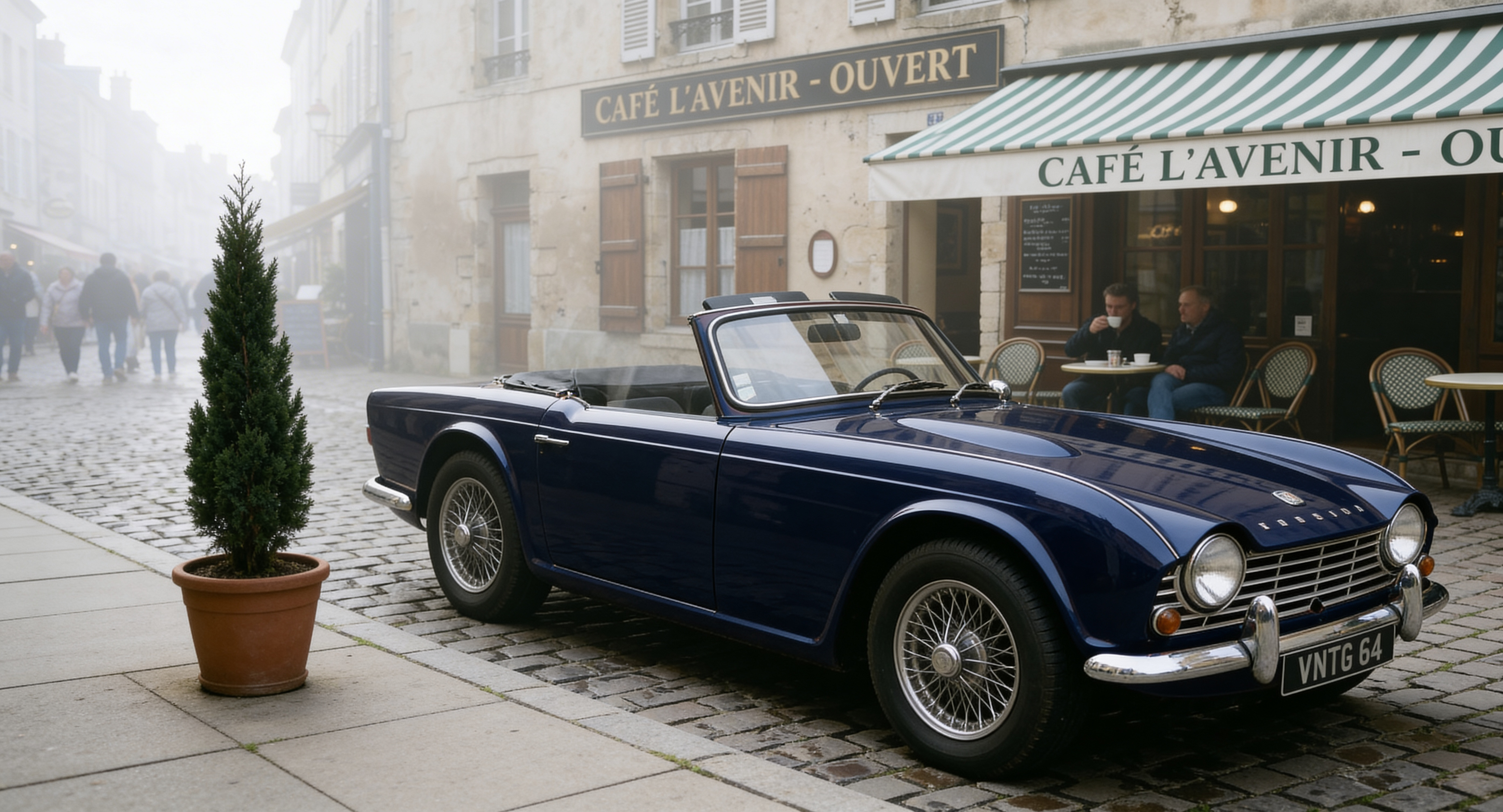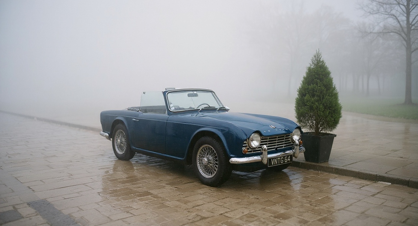 Image editing prompt: "Change the car to deep navy blue, add soft morning fog in the background, and place a small potted cypress tree on the sidewalk beside the car."