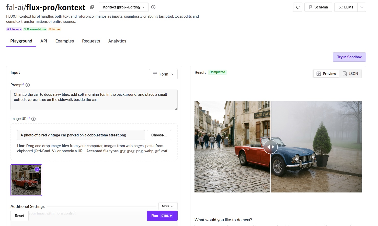 Your auth, error handling, queue logic, and billing stay identical whether you're editing with Nano Banana 2 for fast semantic changes, FLUX.2 [pro] for production compositing, or Kontext for iterative character edits.