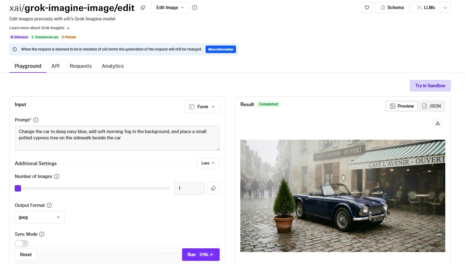 - Speed and cost per edit: $0.022 per image. Fast enough for batch processing. Note: requests that violate xAI's terms are still charged, so review their content policy before building automated pipelines.