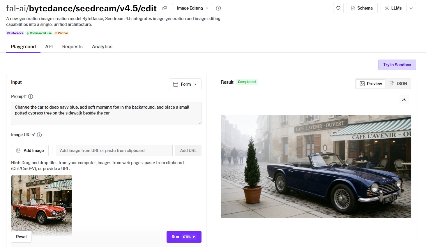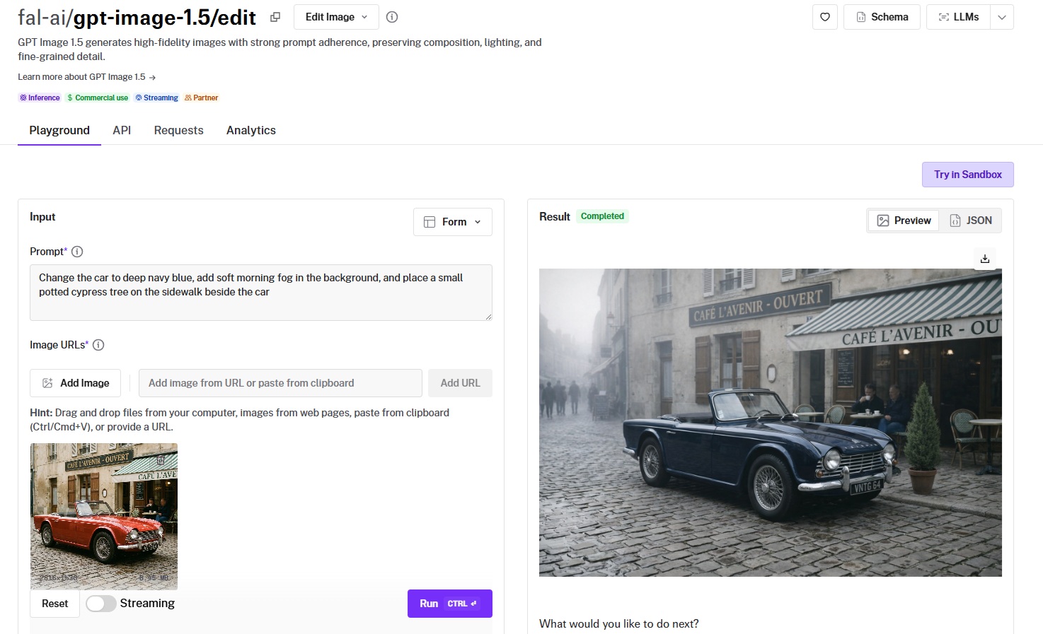 This is what I tested first. Can the model actually do what you ask it to, or does it interpret "change the car to blue" as "repaint the entire scene in blue haze"?