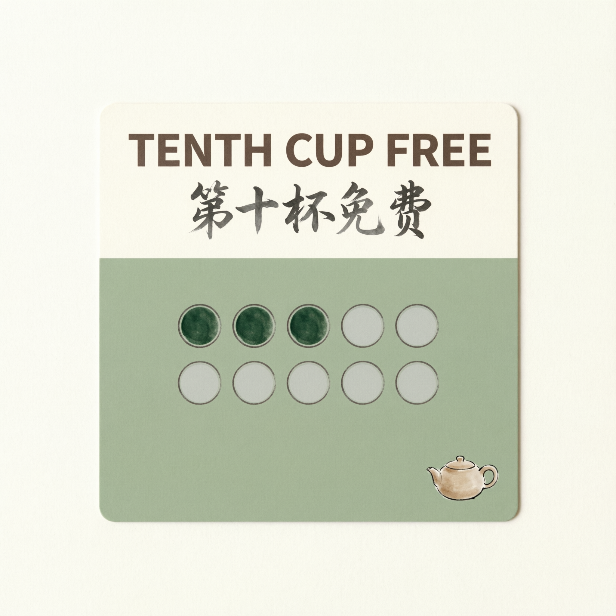 A tea house loyalty card with "TENTH CUP FREE" in clean bold English across the top, "第十杯免费" in brush-style Chinese below, ten small circle stamps in a grid with three filled in, minimalist sage green and cream color scheme with a small teapot icon in the corner.