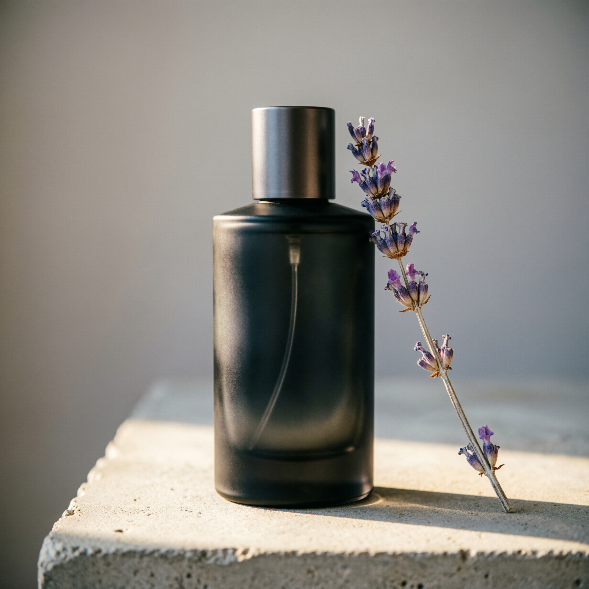 A matte black glass perfume bottle on a raw concrete slab, late afternoon light raking across from the right, casting a long shadow, a single sprig of dried lavender beside it, soft neutral background fading to warm grey, editorial fragrance campaign aesthetic.