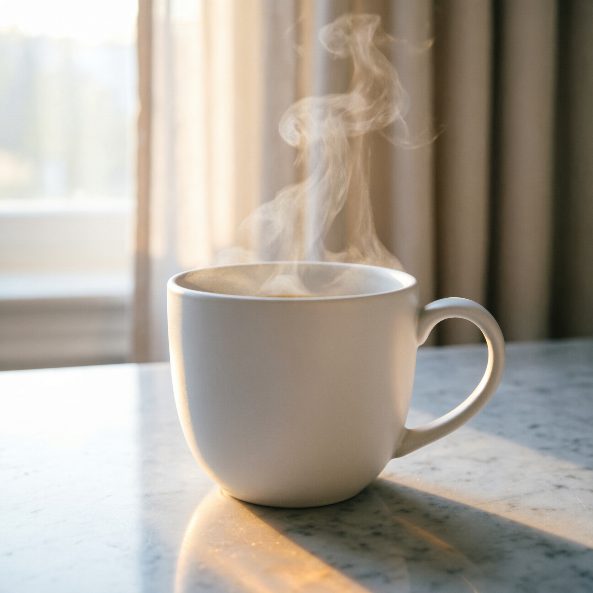 Prompt: A ceramic coffee mug on a marble countertop, morning light through a window, steam rising, shallow depth of field, warm tones.
