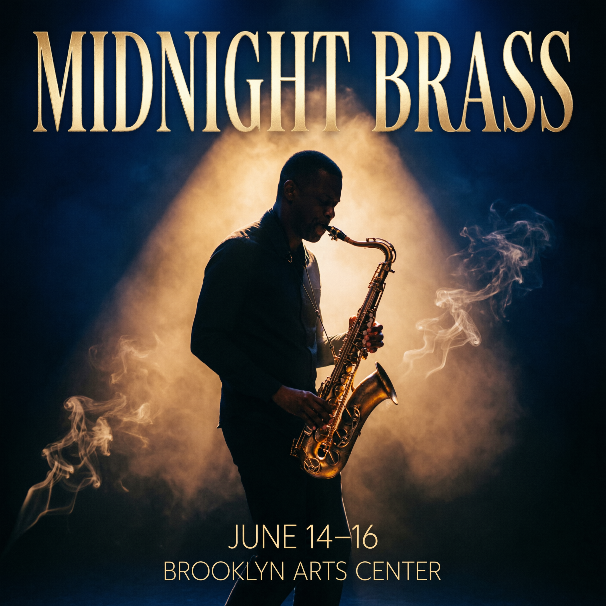 Concert poster for a jazz festival called "MIDNIGHT BRASS" in tall condensed serif at the top, a saxophone player silhouetted against a smoky amber spotlight, "JUNE 14-16" in small caps below, "BROOKLYN ARTS CENTER" in thin sans-serif at the bottom, deep navy and warm gold color palette.