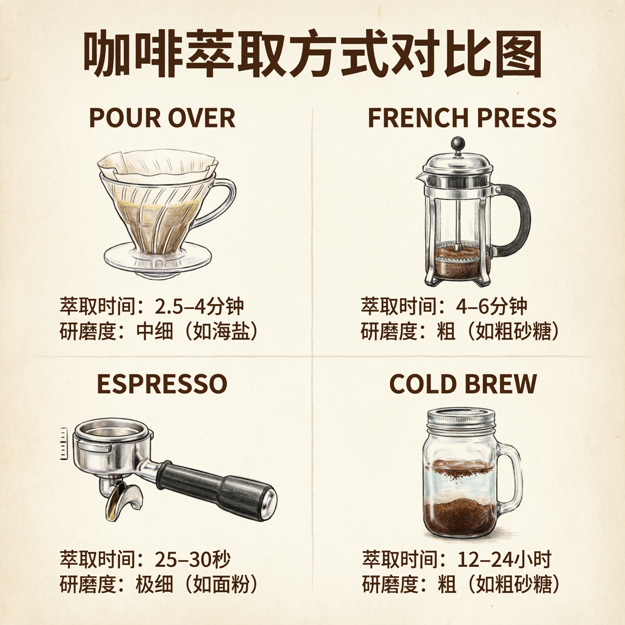 A vertical coffee brewing methods comparison chart with four sections, each showing a different method: "POUR OVER" with a V60 dripper illustration, "FRENCH PRESS" with a plunger diagram, "ESPRESSO" with a portafilter sketch, and "COLD BREW" with a mason jar drawing, brew time and grind size listed under each in clean sans-serif, kraft paper texture background with muted earth tones.