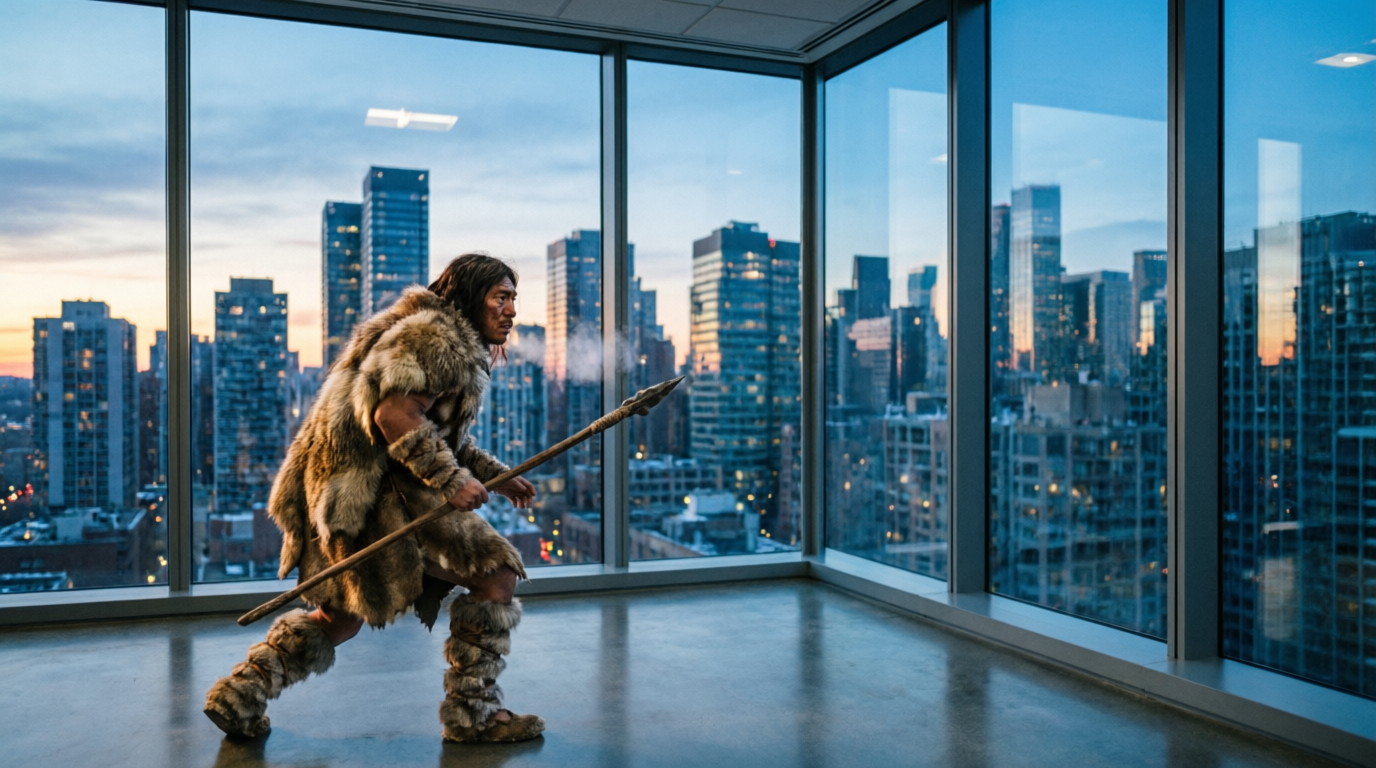 Changing backgrounds: Place the subject in a modern office with floor-to-ceiling windows overlooking a city skyline. Keep the person's pose and clothing identical.