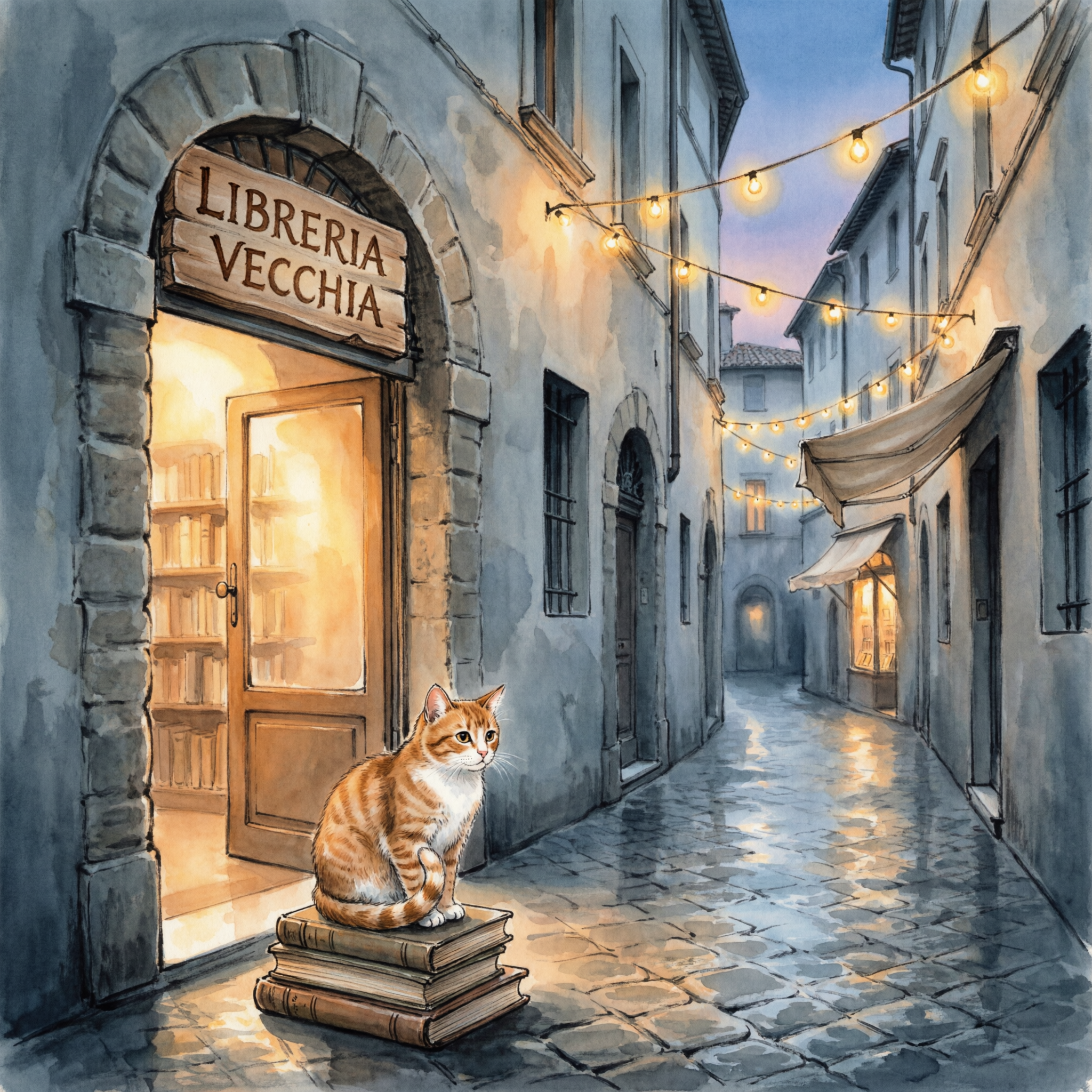 Ink and gouache illustration of a narrow European bookshop alley at dusk, string lights draped between stone buildings, hand-painted shop signs reading "LIBRERIA VECCHIA" above the entrance, warm amber light spilling from the doorway onto cobblestones, a tabby cat sitting on a stack of books by the door.