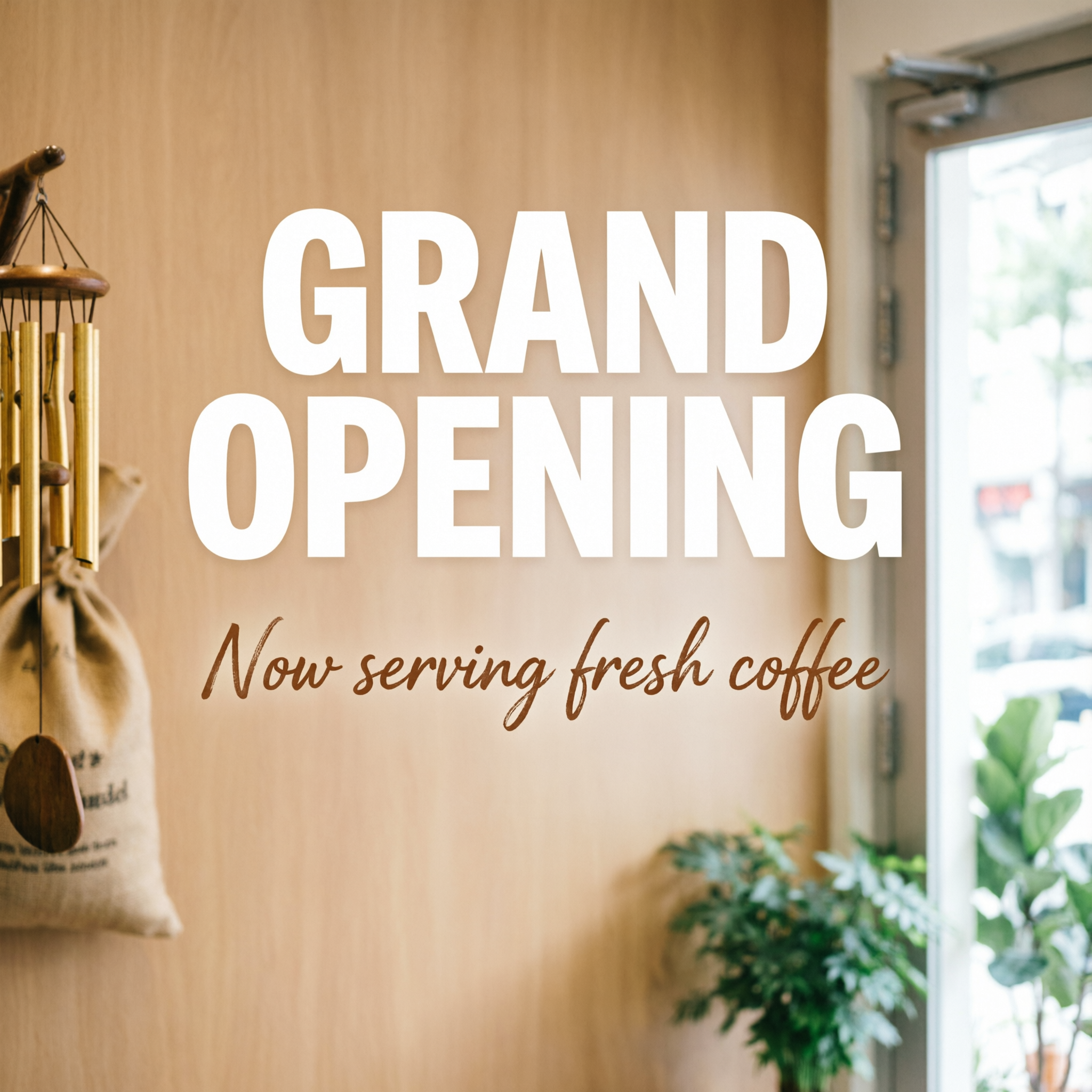 Prompt: "GRAND OPENING" in bold sans-serif at the top, "Now serving fresh coffee" in italic script centered below.