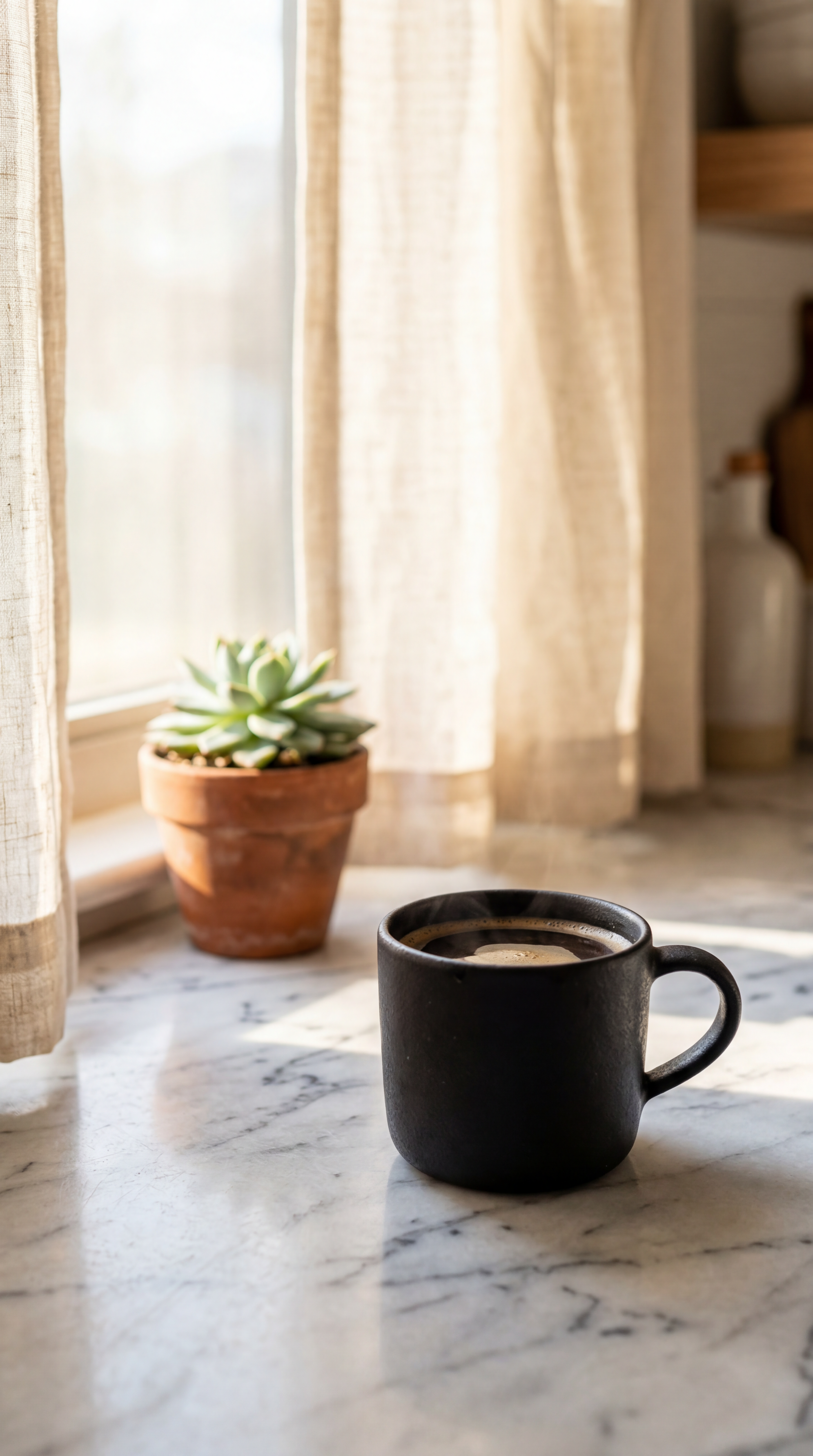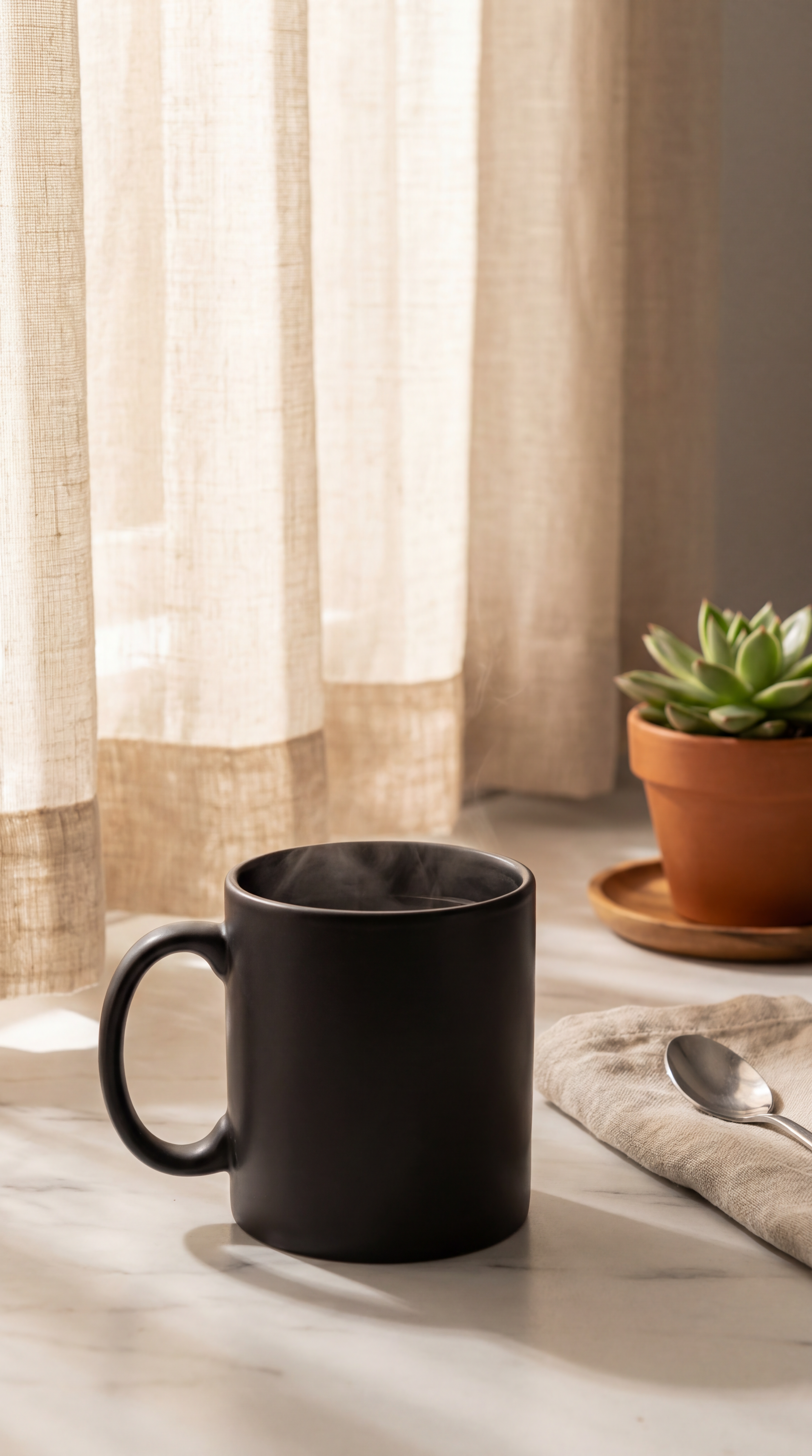 Prompt: "A matte black ceramic coffee mug on a sunlit marble countertop, morning light streaming through linen curtains, a small succulent in the background slightly out of focus, editorial product photography style"