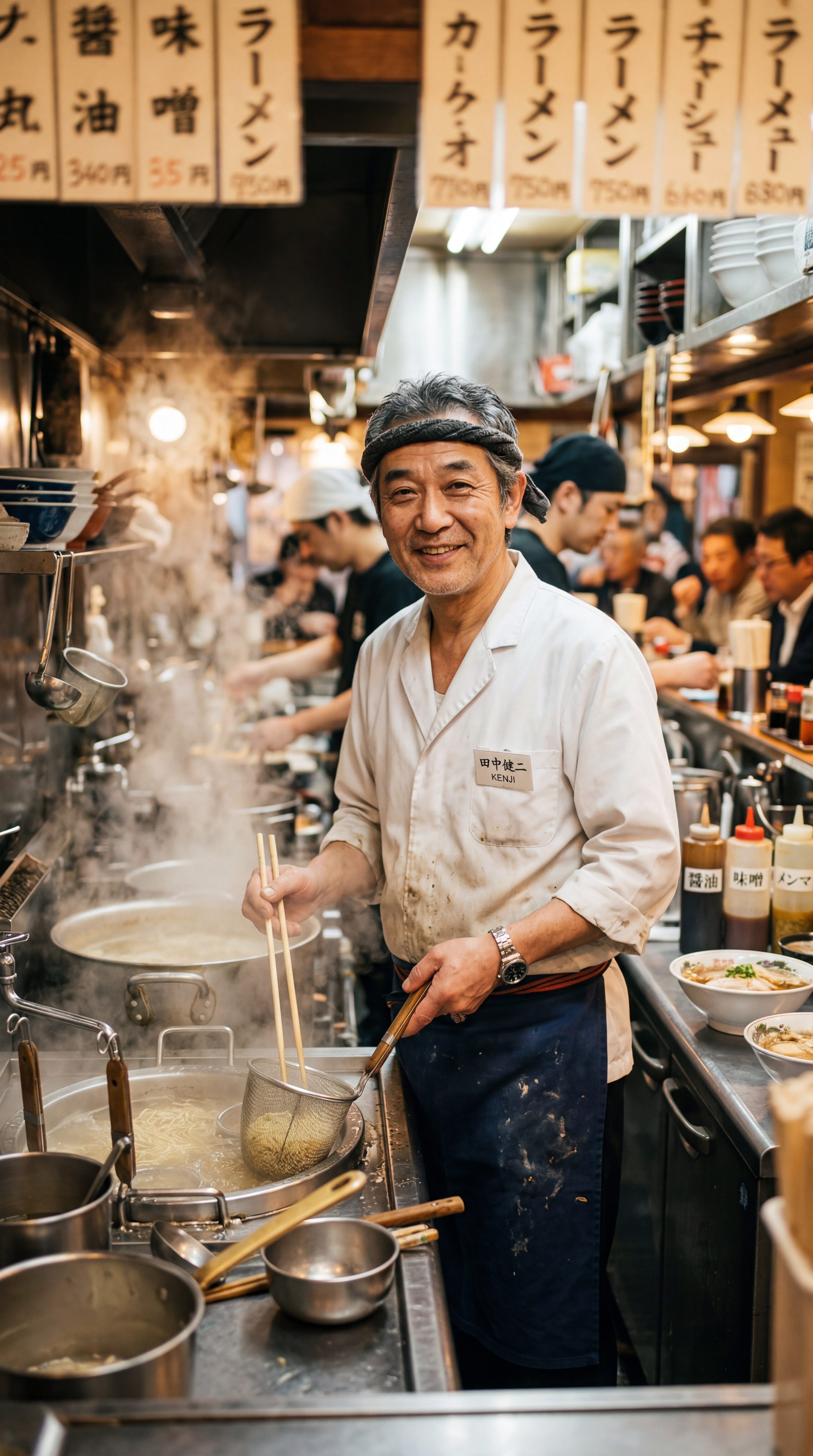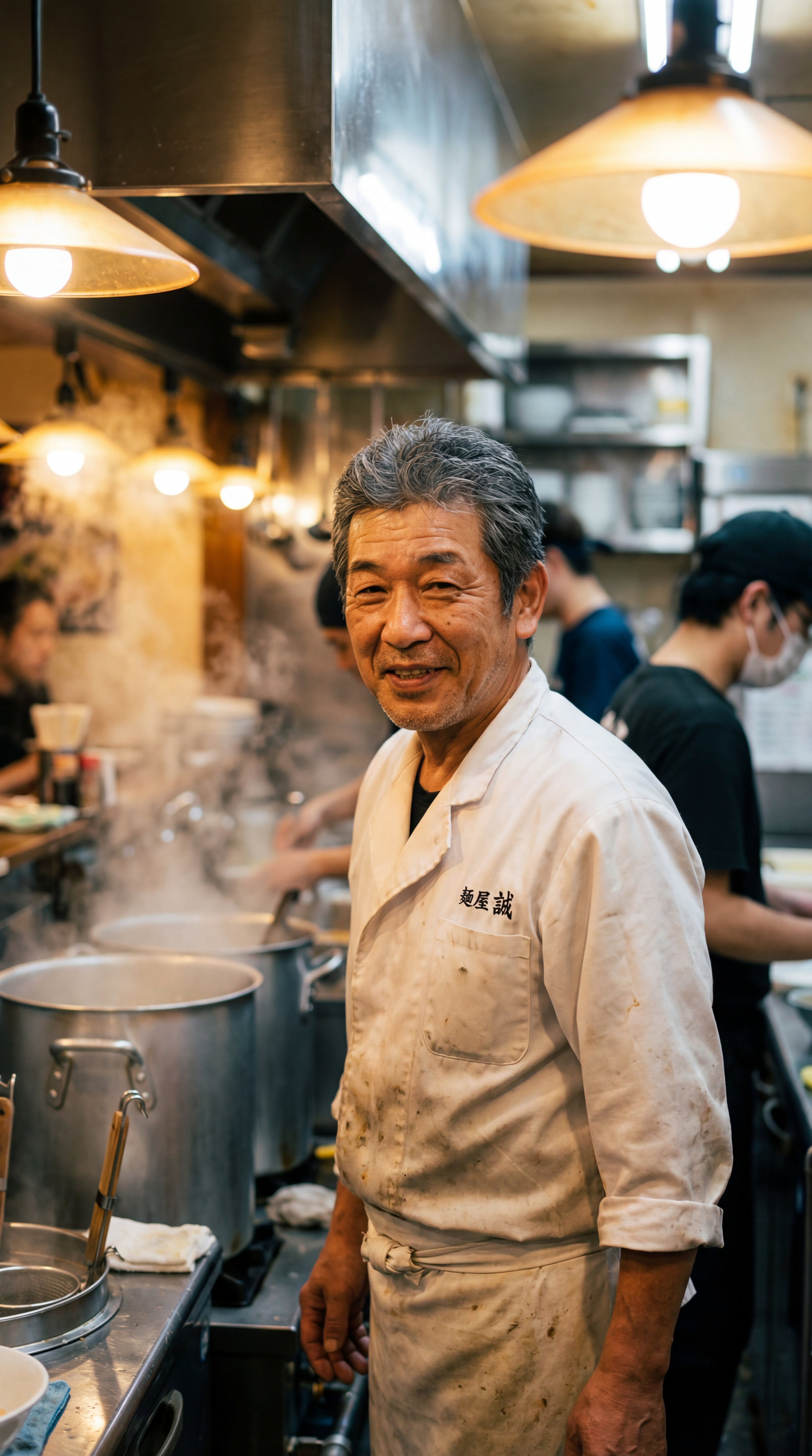 Prompt: "Portrait of a middle-aged Japanese chef in a white coat, standing in a busy ramen kitchen with steam rising from pots, warm tungsten lighting, shallow depth of field, shot on 85mm lens"