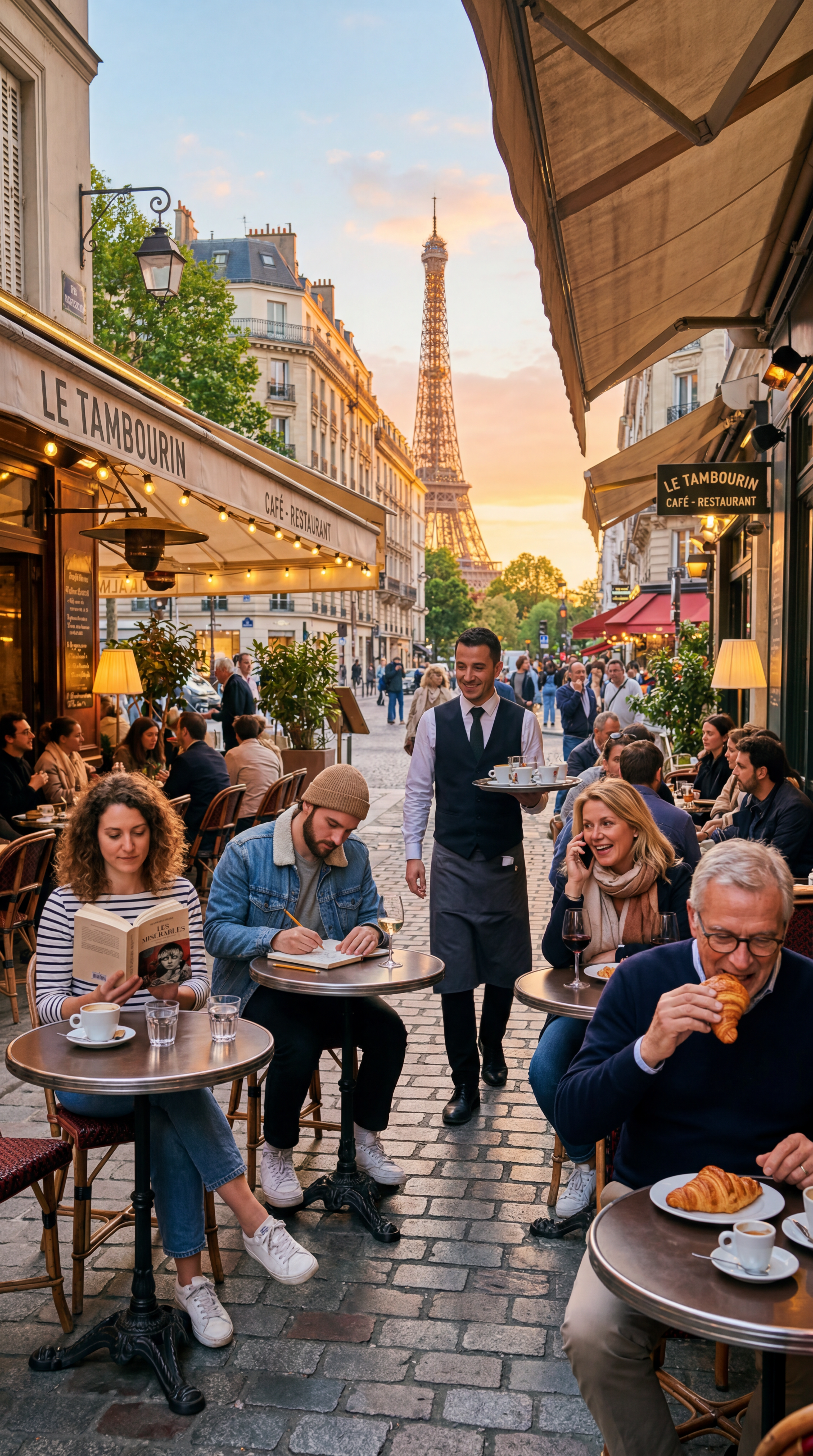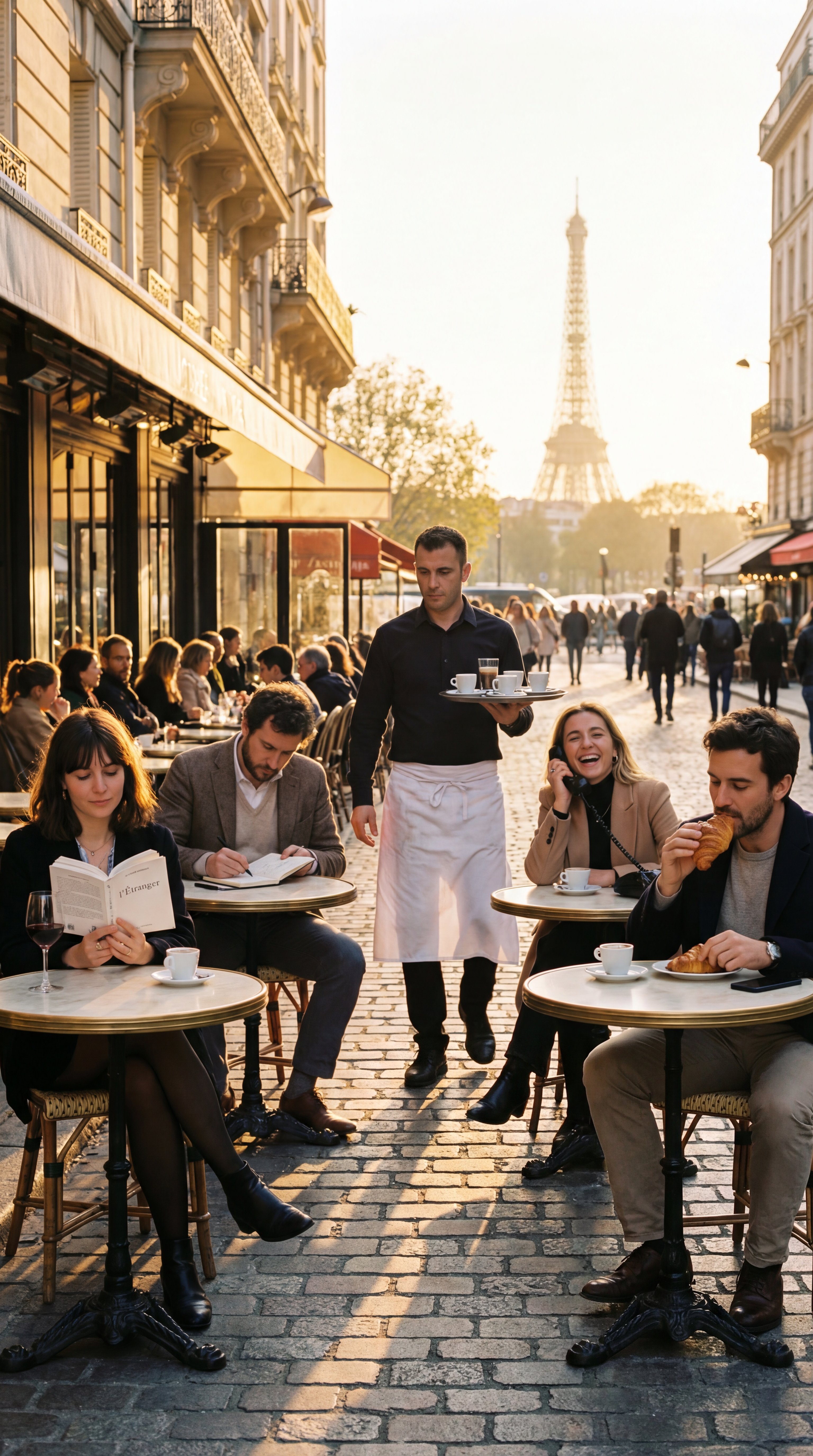 Prompt: "A busy Parisian cafe terrace at golden hour, four people at separate tables each engaged in different activities, reading, sketching, talking on phone, and eating a croissant, with a waiter carrying a tray of espressos in the middle ground and the Eiffel Tower visible in the distance"