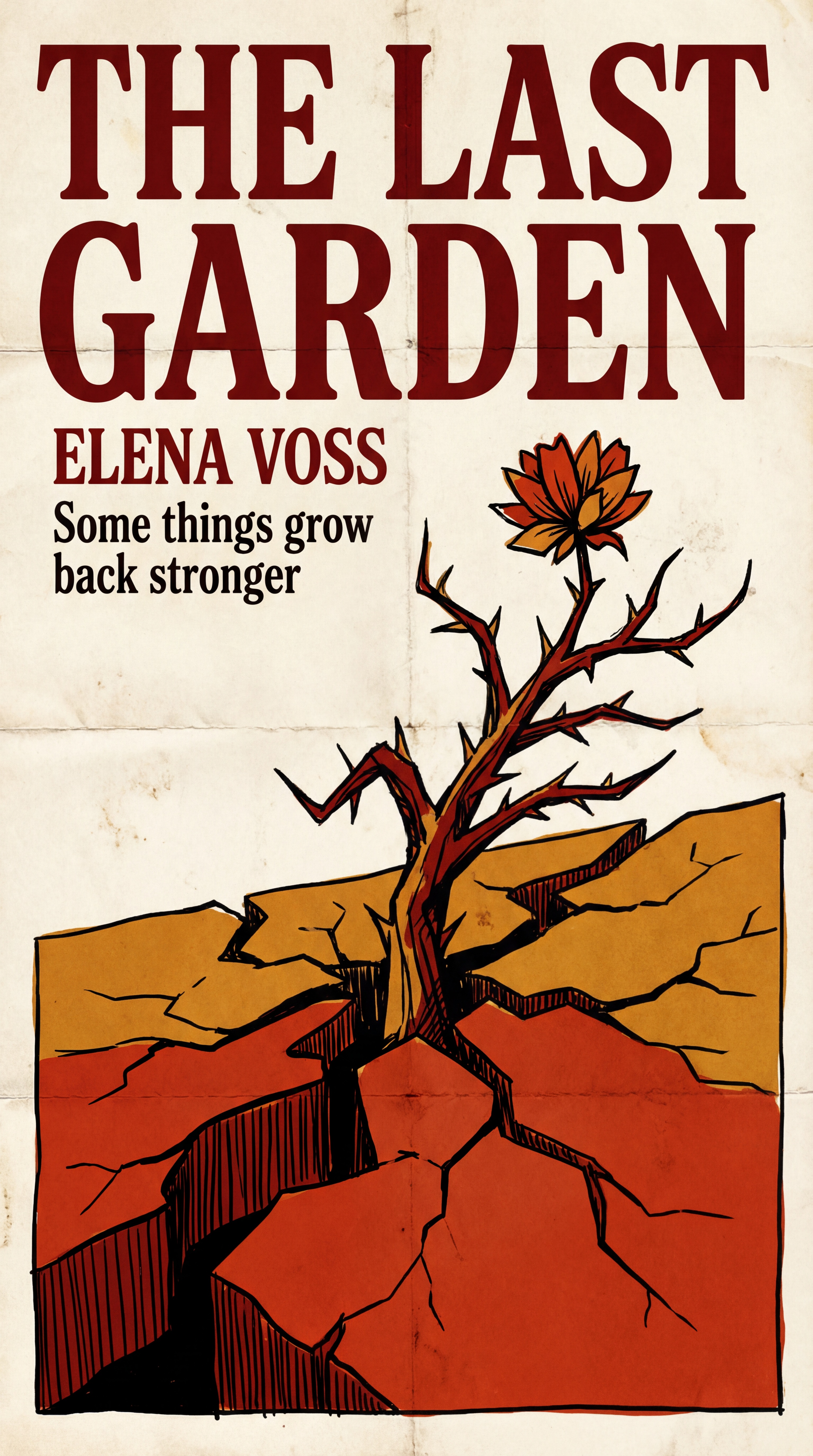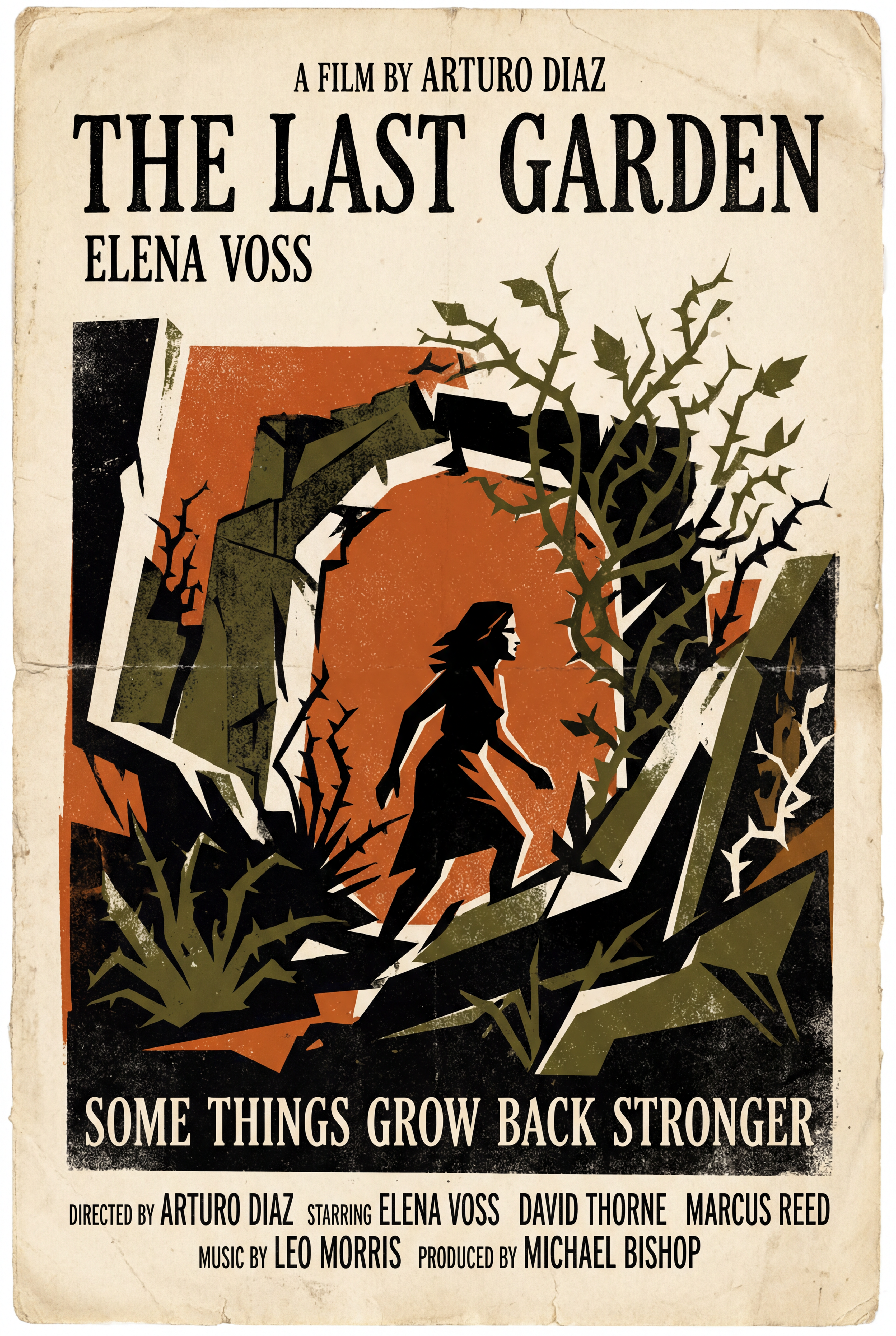 Prompt: "A vintage movie poster for a film called 'The Last Garden' starring Elena Voss, with tagline 'Some things grow back stronger' in serif typography, 1970s Saul Bass-inspired design"