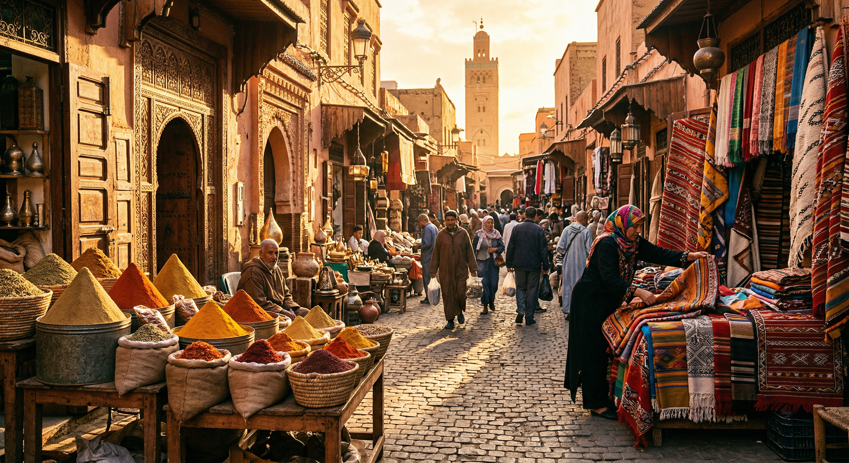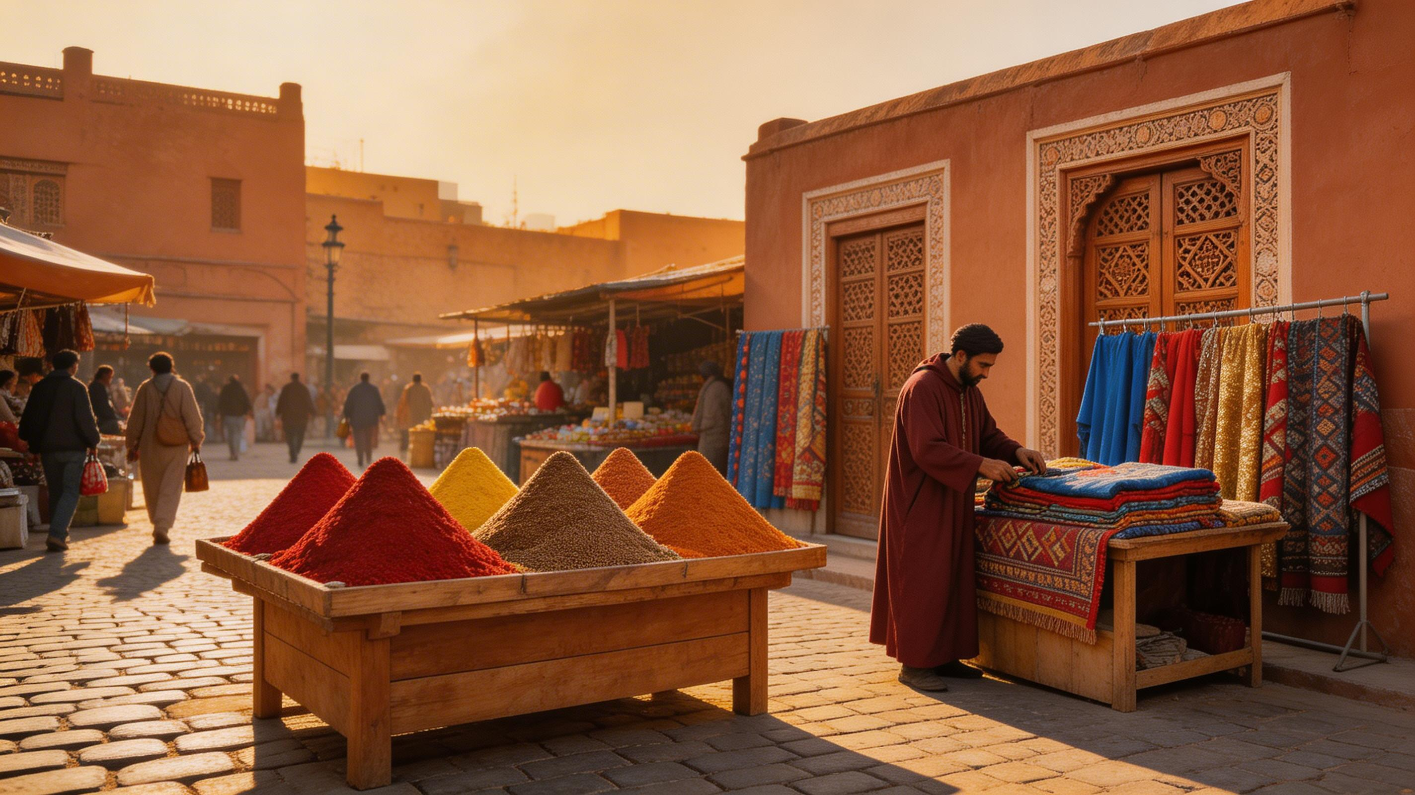 Prompt: "A bustling open-air market in Marrakech at golden hour, spice pyramids in the foreground, a vendor arranging colorful textiles in the midground, terracotta buildings with ornate carved doorways in the background, warm amber light casting long shadows across the cobblestones"