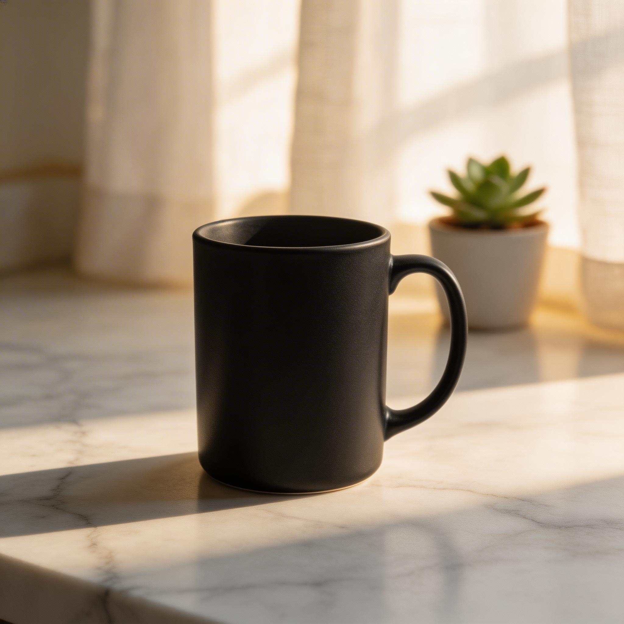 Prompt: "A matte black ceramic coffee mug on a sunlit marble countertop, morning light streaming through linen curtains, a small succulent in the background slightly out of focus, editorial product photography style"
