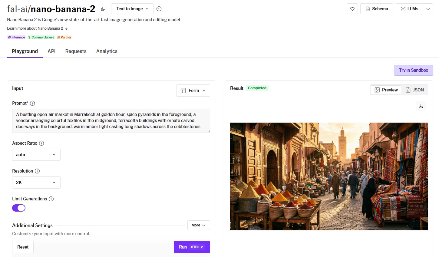 Every model also has a playground on fal, where you can test prompts in your browser before writing any code.
