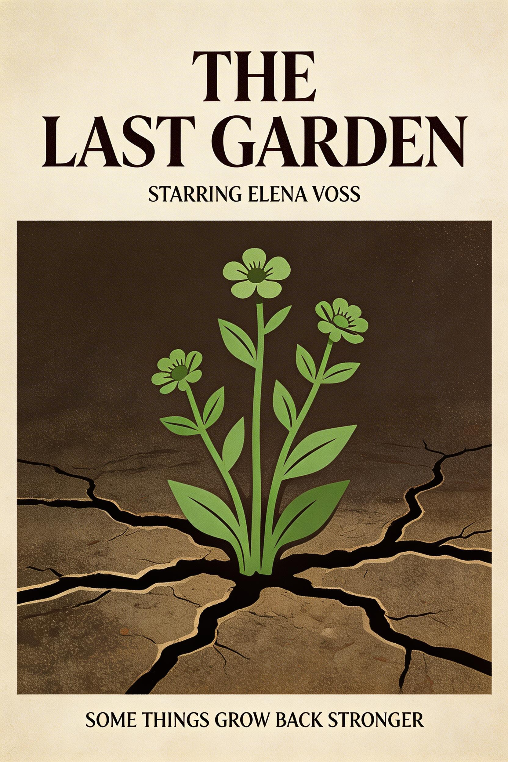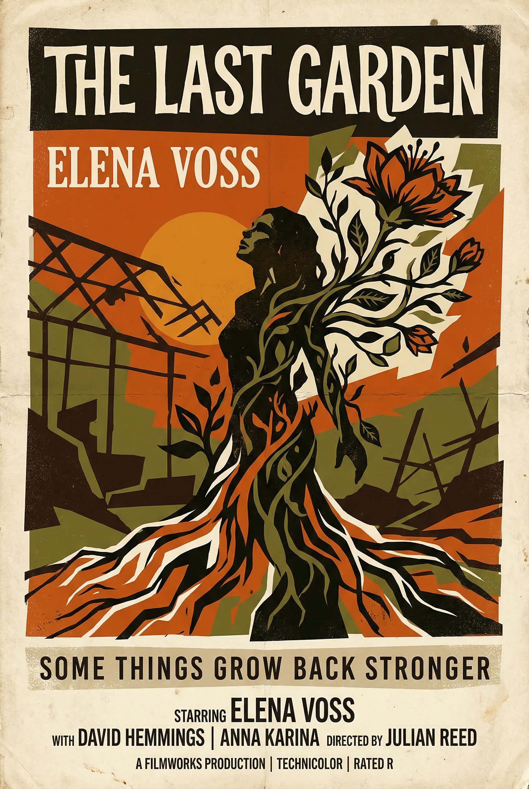 Prompt: "A vintage movie poster for a film called 'The Last Garden' starring Elena Voss, with tagline 'Some things grow back stronger' in serif typography, 1970s Saul Bass-inspired design"