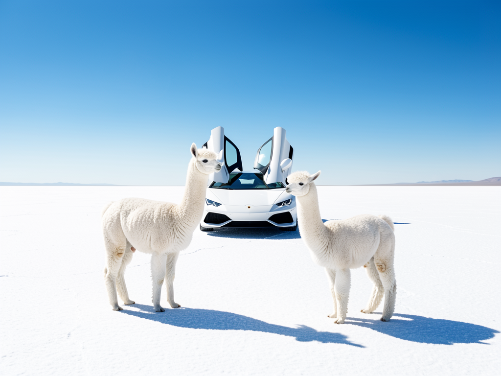 A bright, surreal scene on a vast white salt flat under a clear blue sky, featuring two fluffy white alpacas standing in the foreground. Behind them sits a sleek white supercar with its scissor doors open, creating a dramatic futuristic silhouette. The sunlight is strong and crisp, casting sharp shadows on the ground and giving the image a clean, high-contrast cinematic look. Minimalist composition, playful luxury vibe, ultra sharp detail, wide-angle perspective, high resolution.