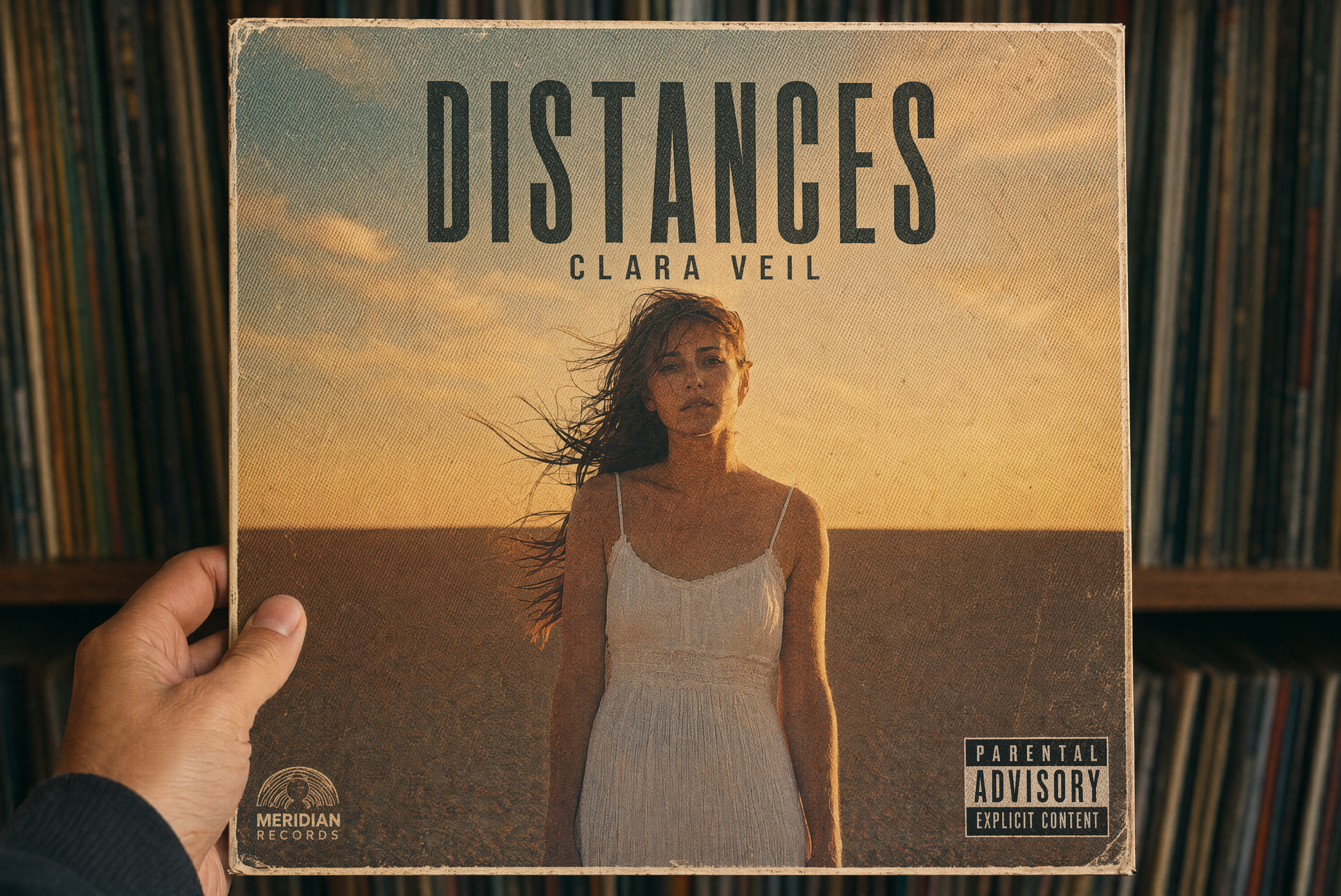 Transform this into a vinyl album cover. Add a bold album title "DISTANCES" in a clean condensed sans-serif across the top. Artist name "CLARA VEIL" in smaller type below it. A parental advisory sticker in the bottom right corner. The image gains a slight halftone print texture and the colors shift toward faded vintage tones. Add a thin white border around the entire image like a physical print. A small record label logo in the bottom left corner reading "MERIDIAN RECORDS". It should look like you're holding an actual vinyl sleeve.